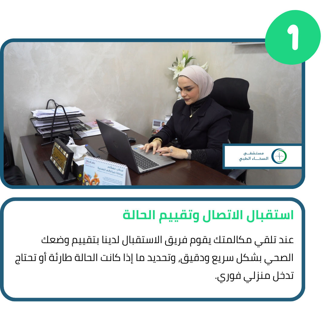 عند تلقي مكالمتك يقوم فريق الاستقبال لدينا بتقييم وضعك الصحي بشكل سريع ودقيق، وتحديد ما إذا كانت الحالة طارئة أو تحتاج تدخل منزلي فوري.