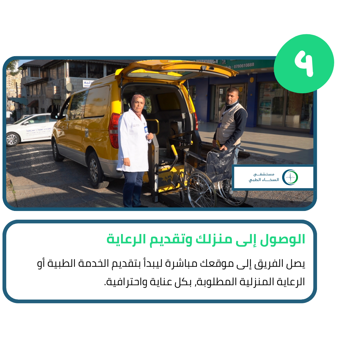 يصل الفريق إلى موقعك مباشرة ليبدأ بتقديم الخدمة الطبية أو الرعاية المنزلية المطلوبة، بكل عناية واحترافية.